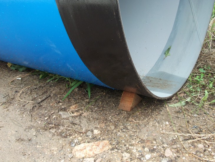 가스관 하부에 쐐기를 설치하여 구름방지조치를 하였습니다.
