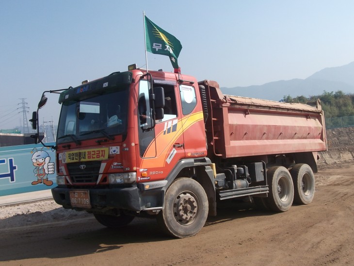 덤프트럭에 안전블럭이 설치되어 있습니다.수리 등 작업 시하강을 방지하기 위하여위로 올려 거치한 후 작업에 임하여야겠습니다.