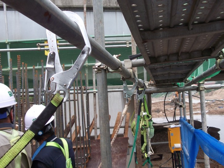 외부비계 띠장에 안전대를 거치하였습니다.