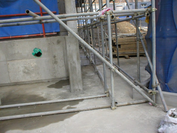 외부비계 하부에 강관비계를 이용하여 밑둥잡이를 설치하였습니다.