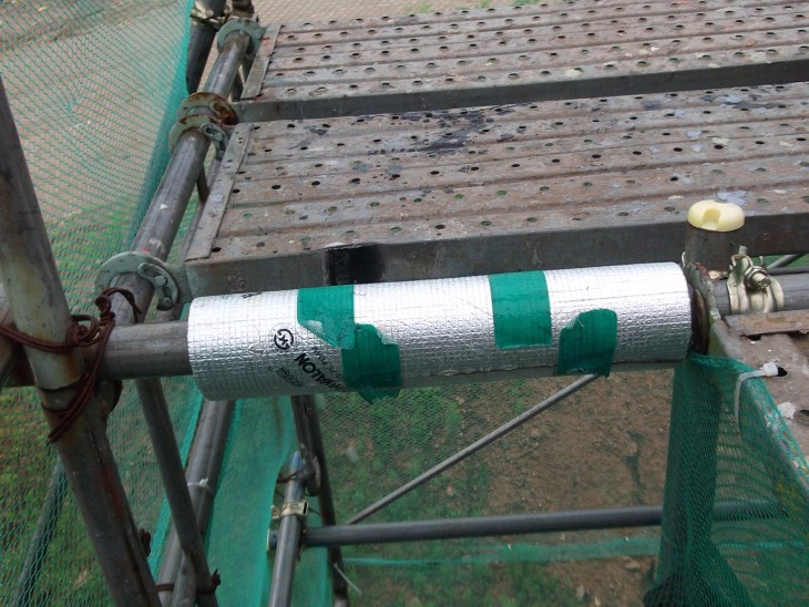 외부비계 하부에 강관비계를 이용하여 밑둥잡이를 설치하였습니다.