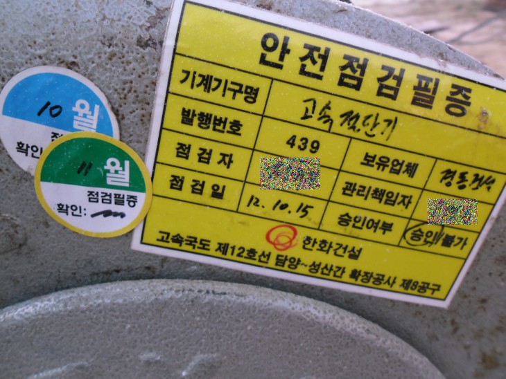 덤프트럭에 장비사용 허가증을 부착하였습니다.
