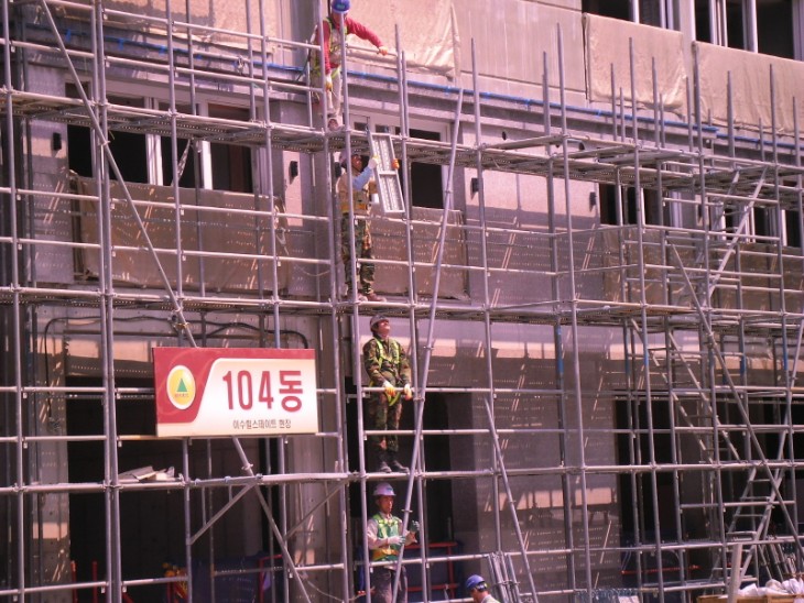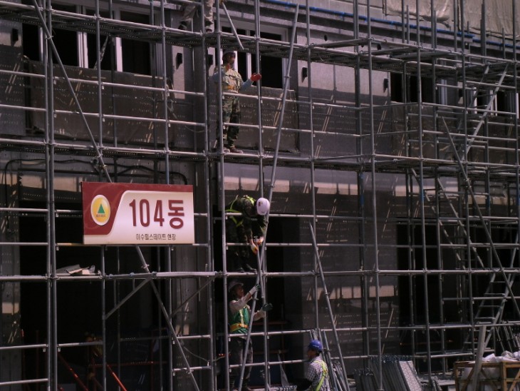 외부비계의 추락방지 시설들이 양호하게 설치되었습니다.