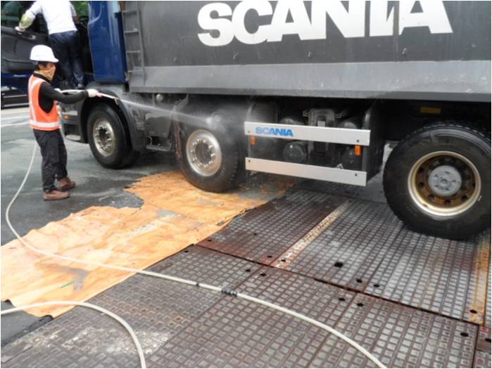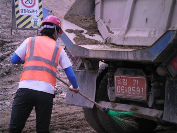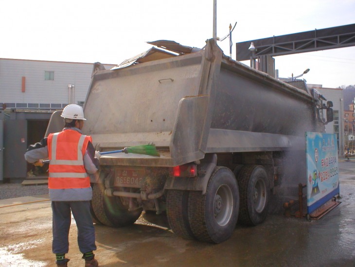 덤프트럭 반출시에 토사 제거 및 살수를 하여 청소를 합니다.