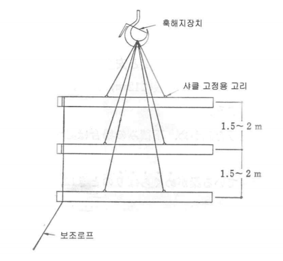 - 각 부재의 간격은 그림과 같이 1.5 m~2 m 정도가 적당하며, 크레인 훅으로부터의 길이가 2 m, 3.5 m, 5 m 정도 되도록 달아맨다.