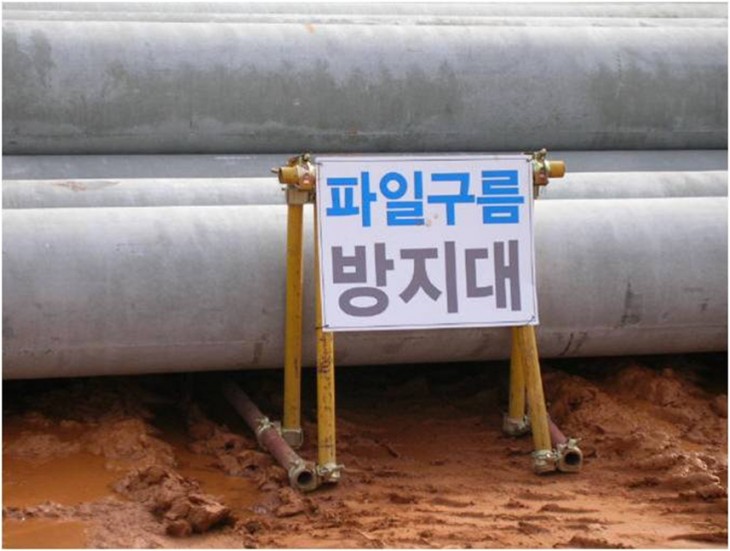 적치한 P·H·​C 파일 하부에 구름 방지대를 설치하였습니다.