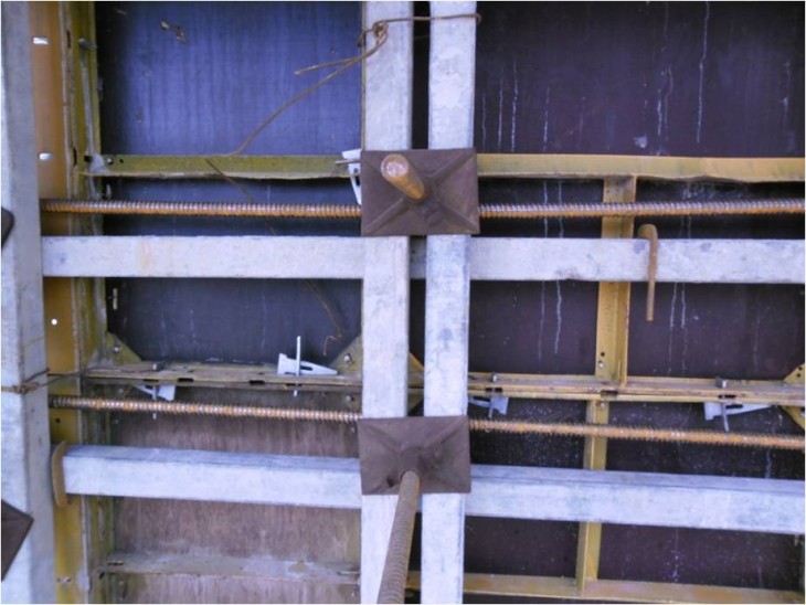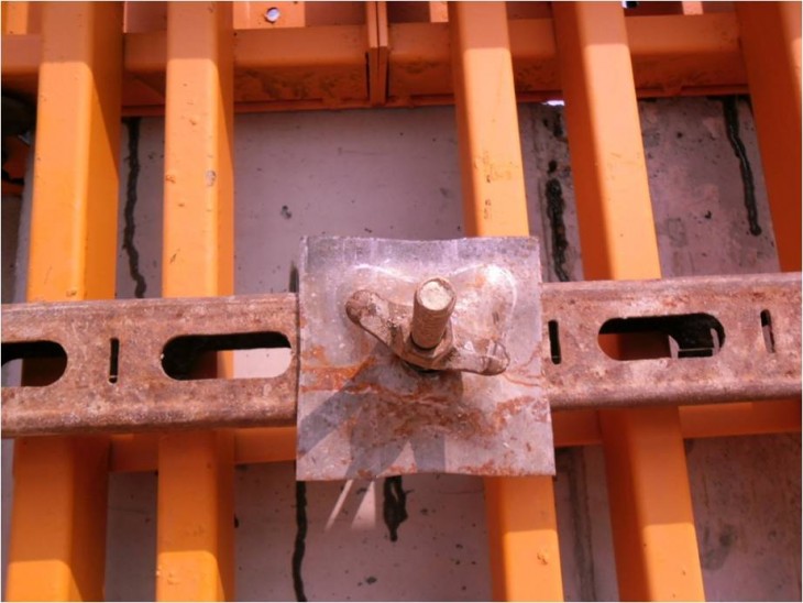 갱폼(GANG-FORM), 알폼(AL-FORM), 유로폼(EURO-FORM)의 수직 또는 수평재 등에 WASHER(워셔)를 정방향으로 설치하여 측압 등에 대비합니다.