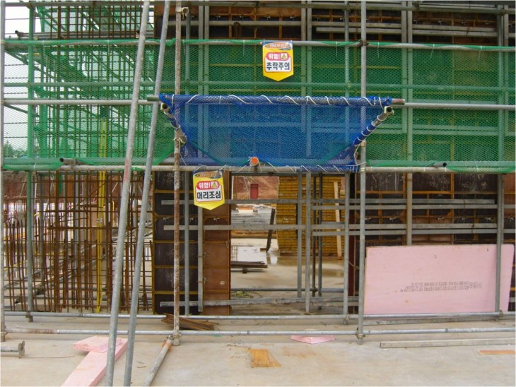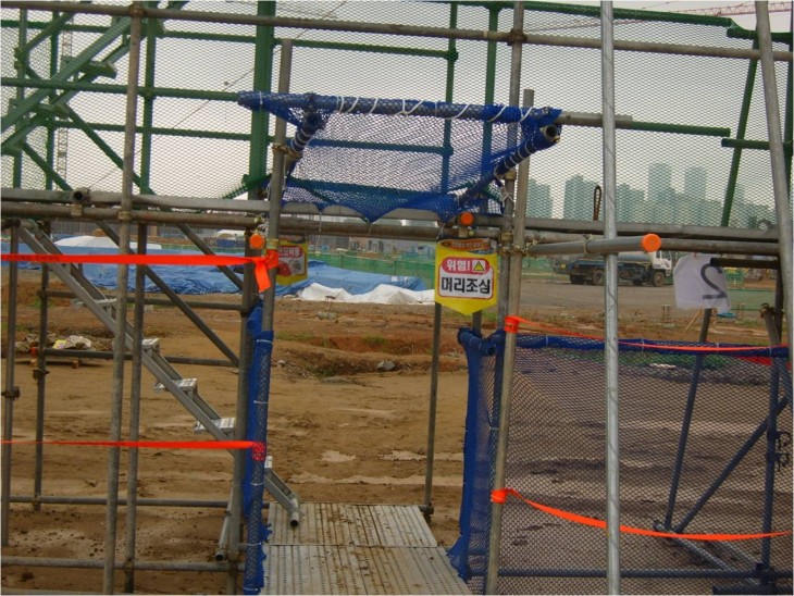 작업발판과 벽체 사이 낙하방지 쪽망 설치상태 양호