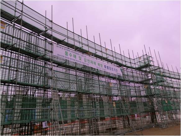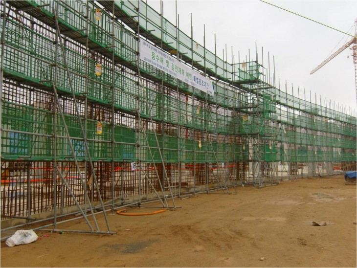 벽체의 외부비계 설치상태 양호_안전난간대, 수직방망 등