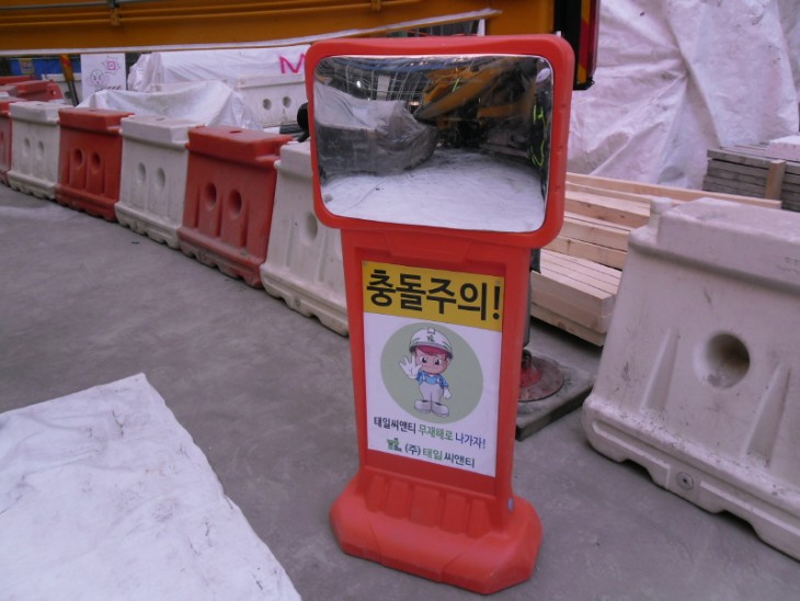 콘크리트펌프카 충돌방지장치 : 충돌방지 거울과 아웃트리거 비상점멸등