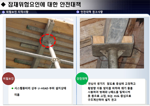 시스템동바리 상부 U-HEAD 부위 설치상태 미흡 : 3쪽으로 구성되어 있습니다.
