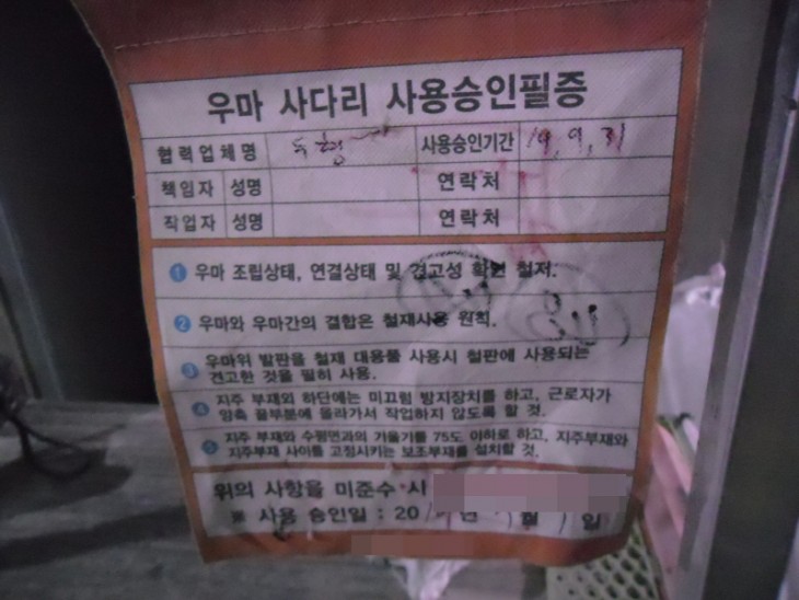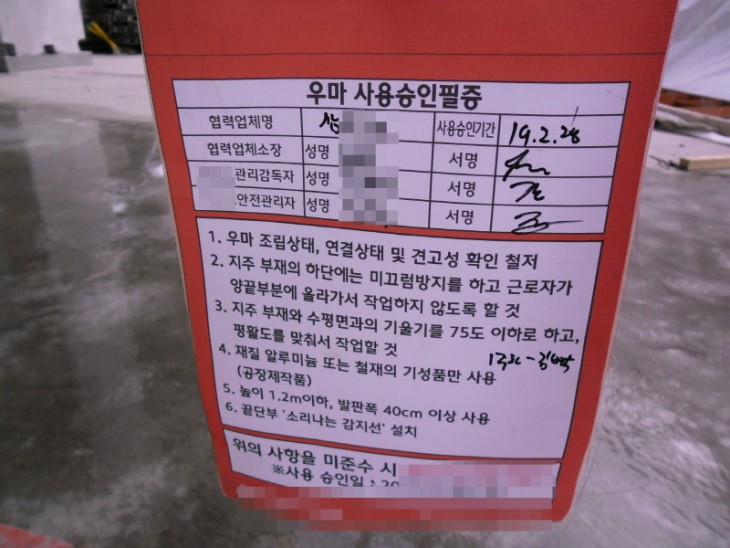 말비계(안장비계, 우마) 사용 승인 필증을 설치하였습니다.
