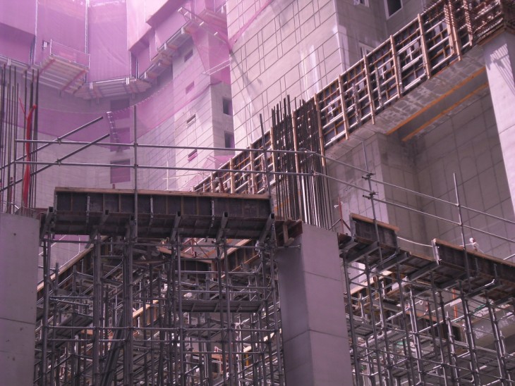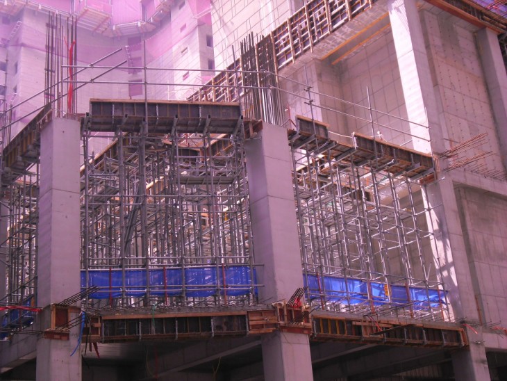 기둥 거푸집에 여러가지 추락방지 안전시설물을 설치하였습니다.