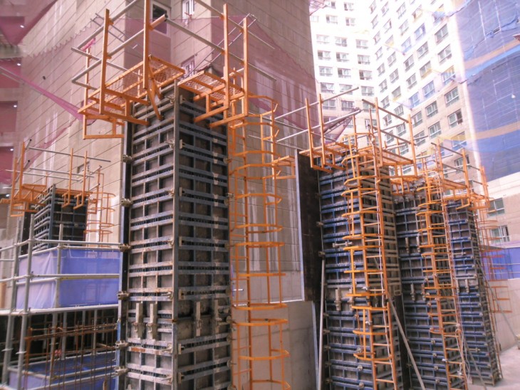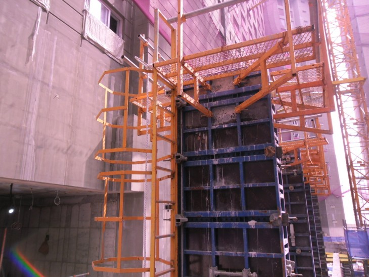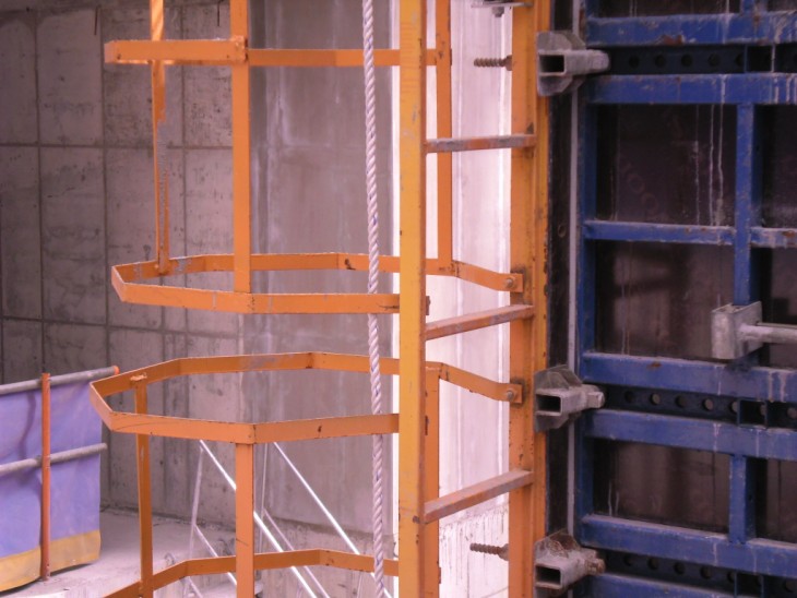 기둥 거푸집에 여러가지 추락방지 안전시설물을 설치하였습니다.