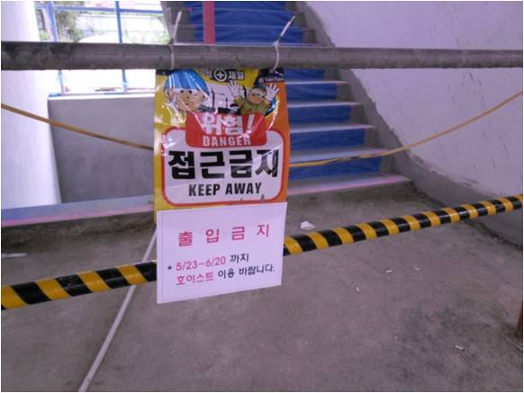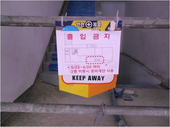 주 출입구 낙하방지 및 안내표지 등 양호