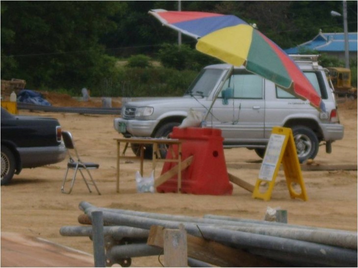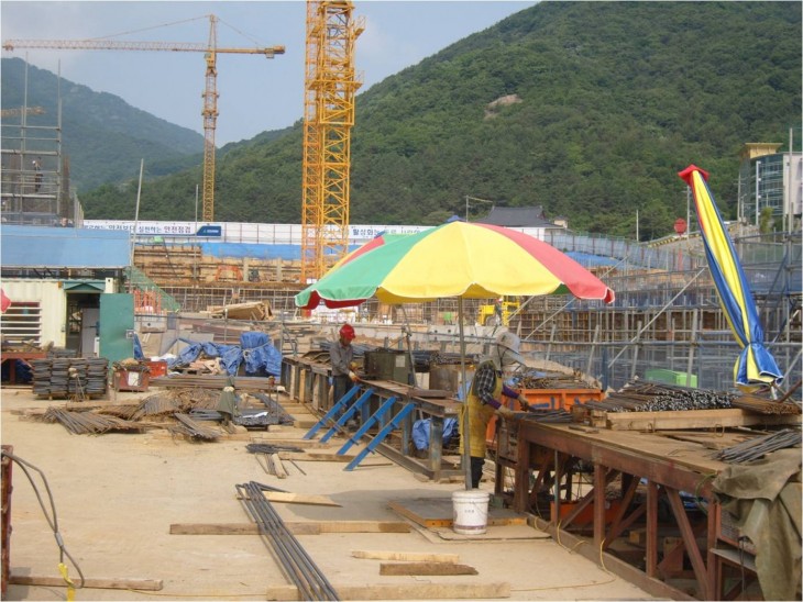 혹서기 철근가공장 근로자를 위한 파라솔 설치상태 양호
