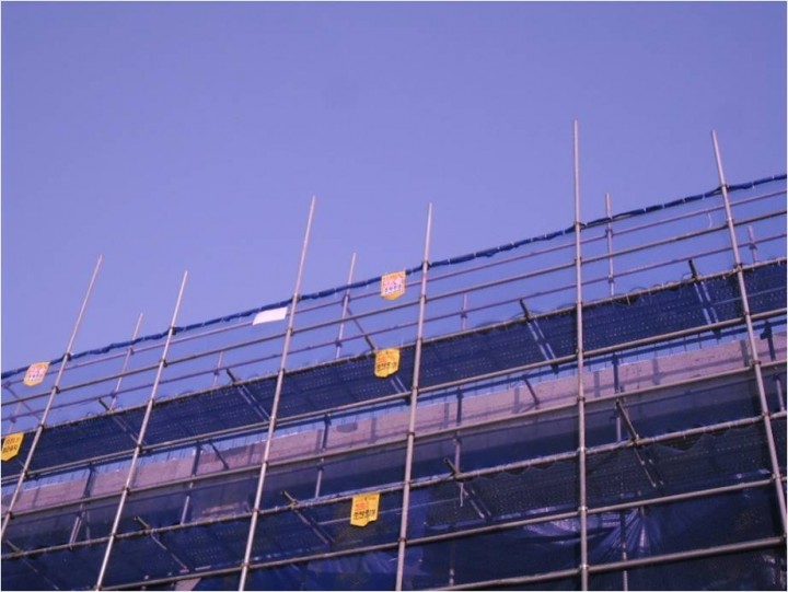 외부비계의 추락방지 시설들이 양호하게 설치되었습니다.