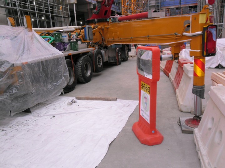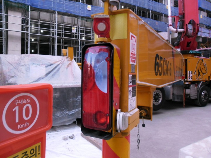 콘크리트펌프카 충돌방지장치 : 충돌방지 거울과 아웃트리거 비상점멸등