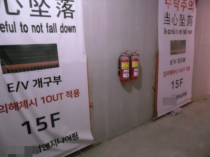 각층 엘리베이터 개구부 중앙에 소화기를 비치하였습니다.
