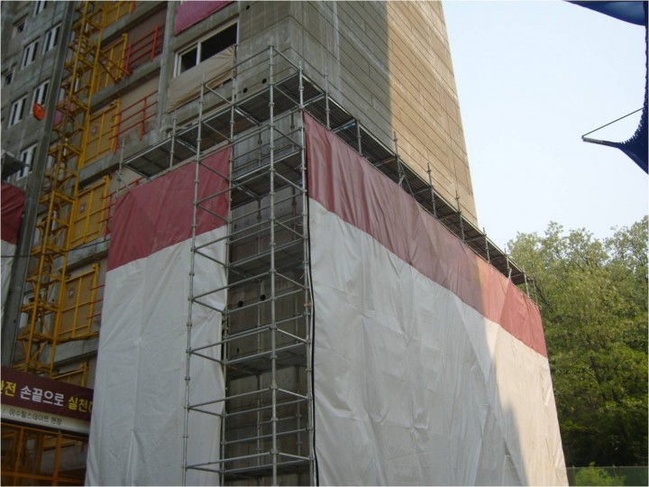 교량 주탑 외부비계의 외부에 통풍구 조치(강풍에 의한 도괴방지)