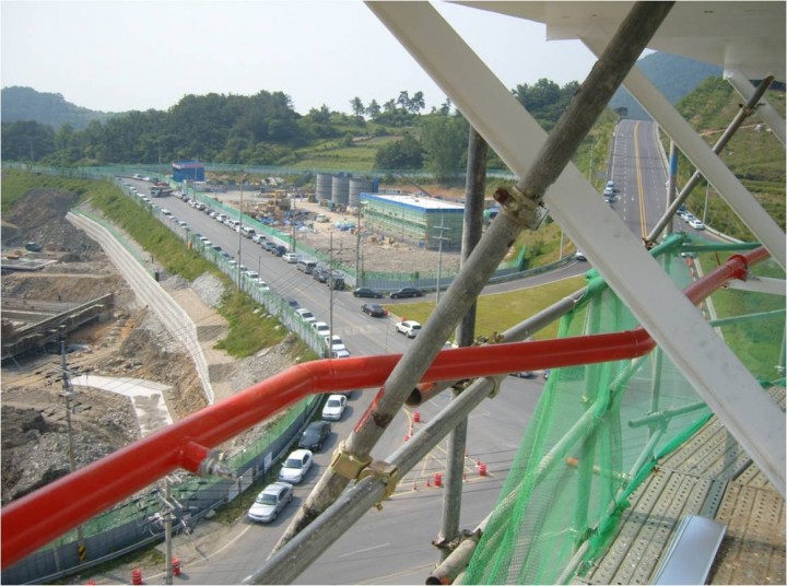외부비계 가새 및 상부 견고히 고정 (빨간 부분)