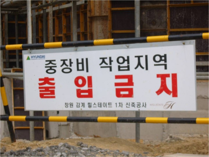중장비 작업지역 출입금지 안전표지판