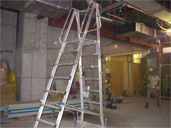 상부에 작업발판이 있는 사다리 사용 중